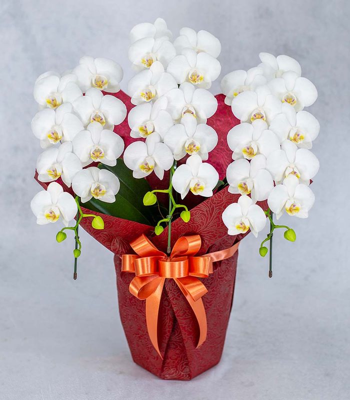 モテギ洋蘭園が初めて胡蝶蘭づくりに取り組んだルーツとも言えるミディ胡蝶蘭です。モテギ洋蘭園といえば「アマビリス」というイメージの方も多くいる代表的な品種です。清楚で気品のある白い胡蝶蘭は年齢、シーンを問わず幅広く愛されております。御祝にはもちろんラッピングの色を変えればお供えにもご利用いただけます。