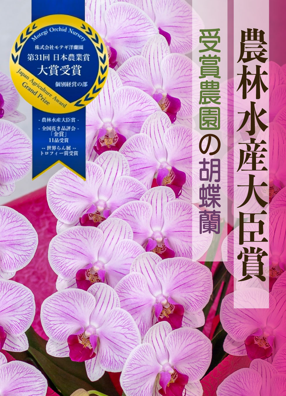 各種品評会で受賞歴があり、3年連続で農林水産大臣賞受賞をしている国内最高と評価されるモテギ洋蘭園の胡蝶蘭の品質をEFLAでぜひご体感ください。
