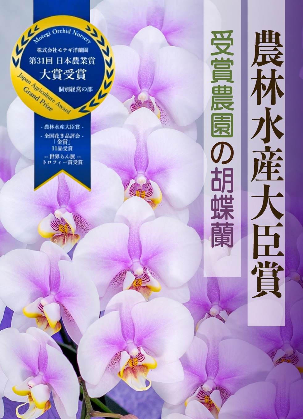 各種品評会で受賞歴があり、3年連続で農林水産大臣賞受賞をしている国内最高と評価されるモテギ洋蘭園の胡蝶蘭の品質をEFLAでぜひご体感ください。