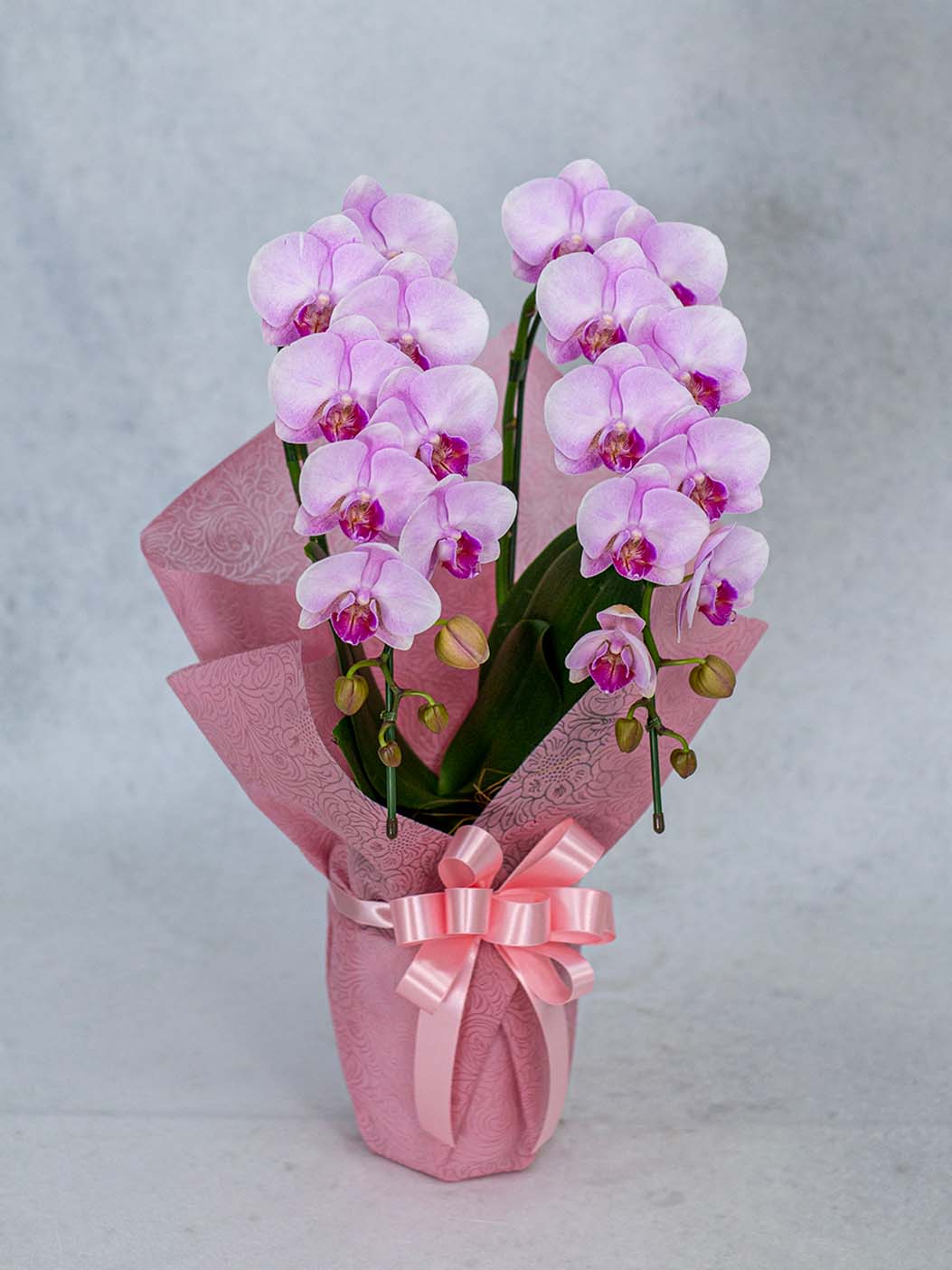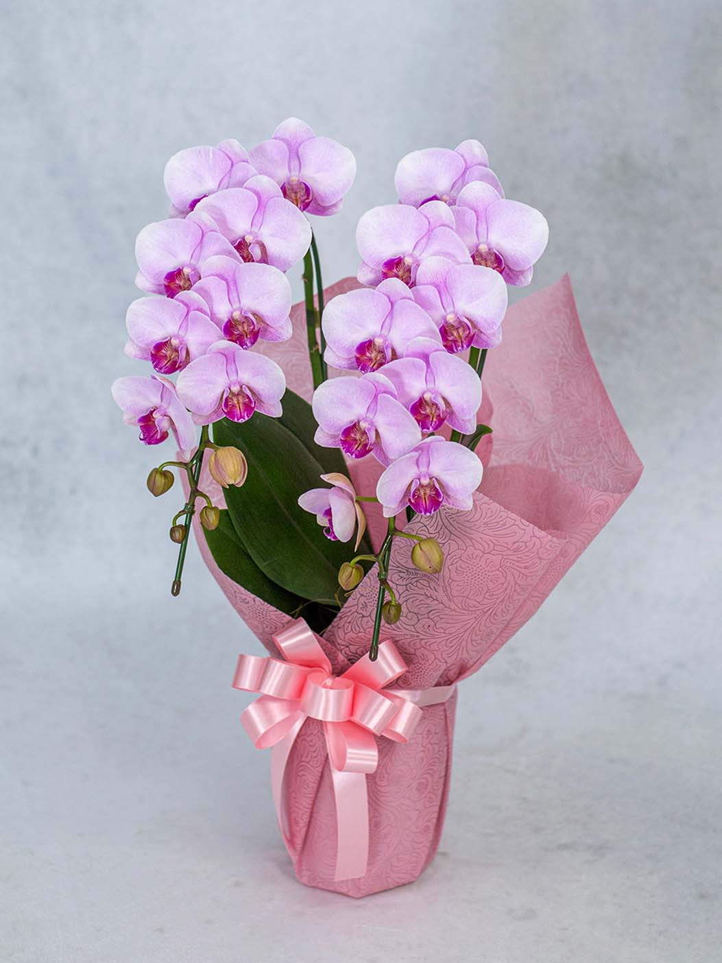 一般的な胡蝶蘭より長い育成期間をかけ、花持ち・茎の強さ・花並びが美しい株のみを厳選。