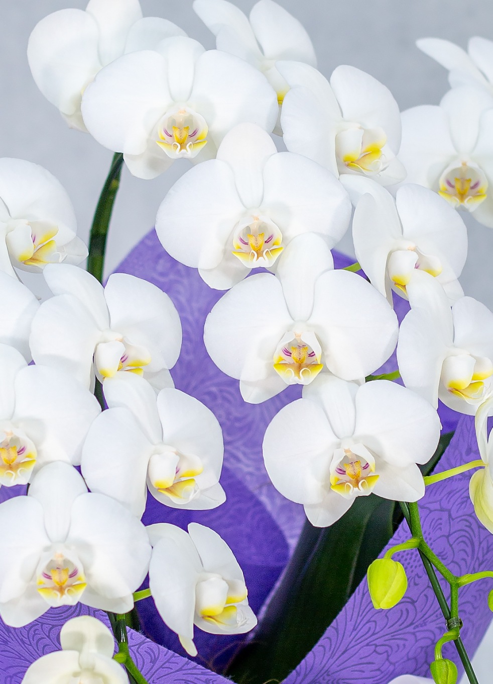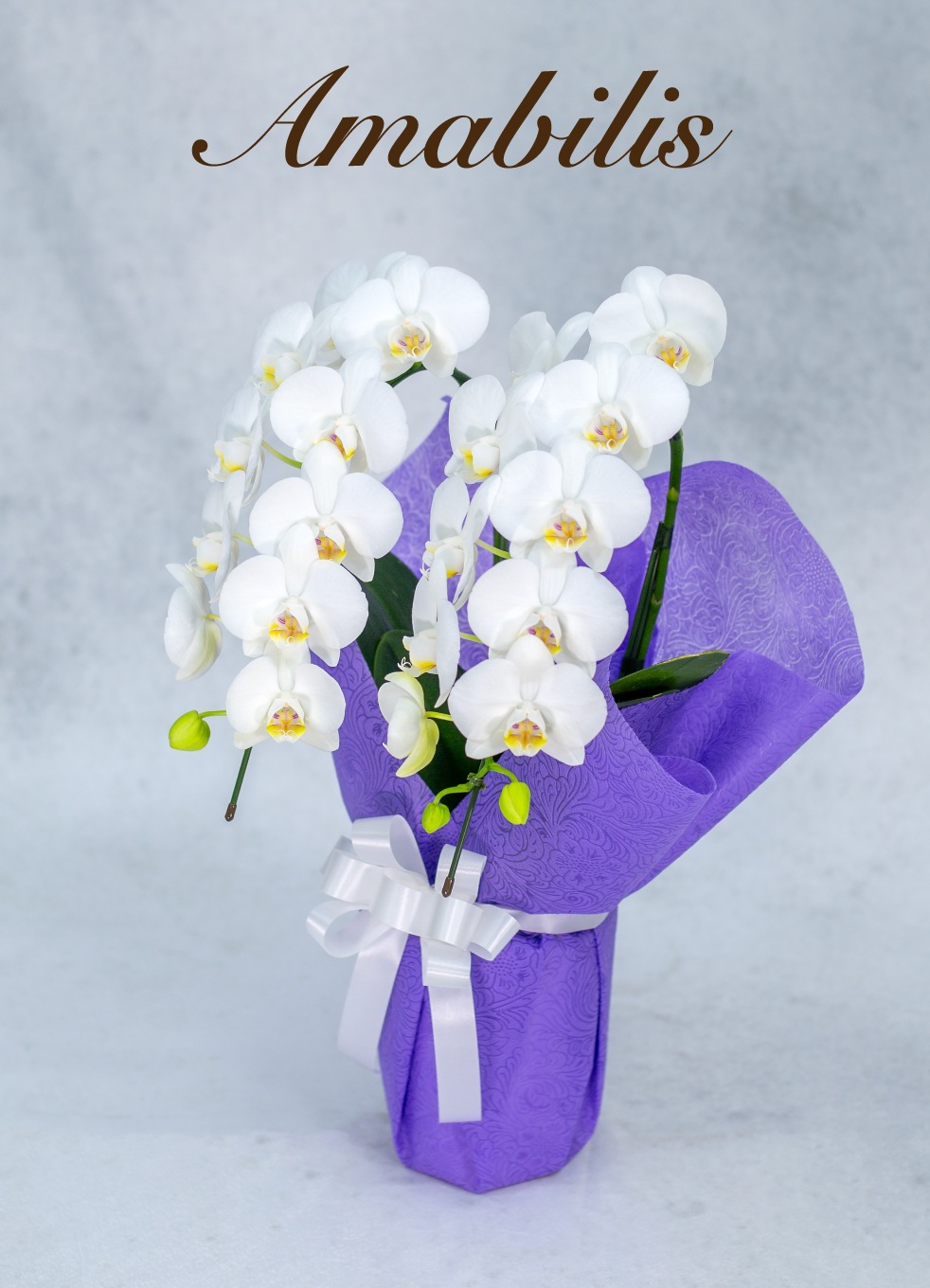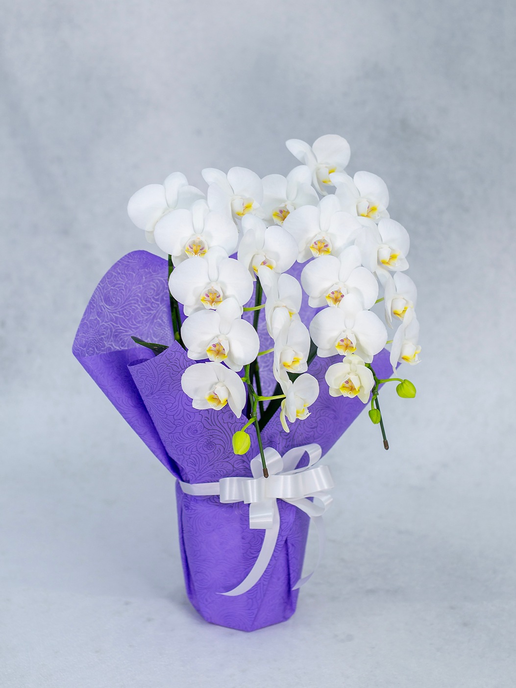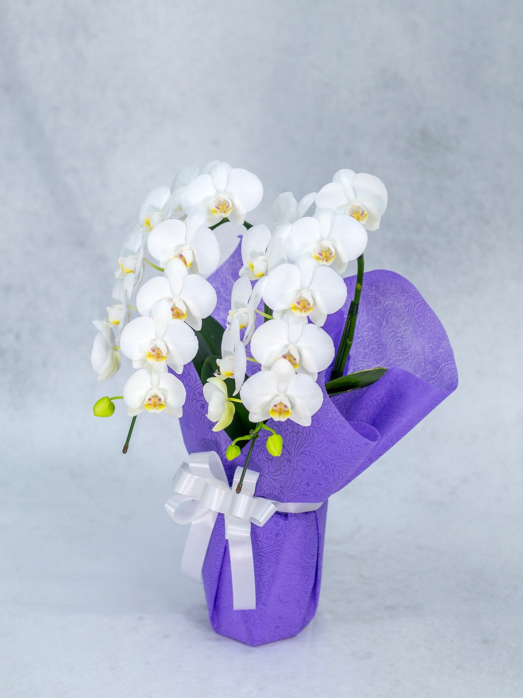 一般的な胡蝶蘭より長い育成期間をかけ、花持ち・茎の強さ・花並びが美しい株のみを厳選。