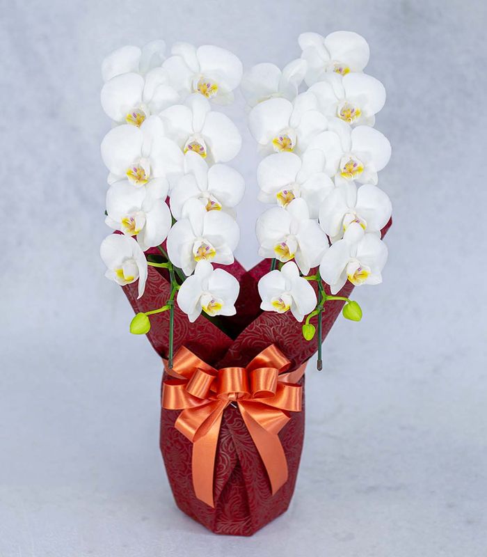 一年を通してお祝いごとに用いられることが多い、紅白の縁起の良いミディ胡蝶蘭「タイアン」