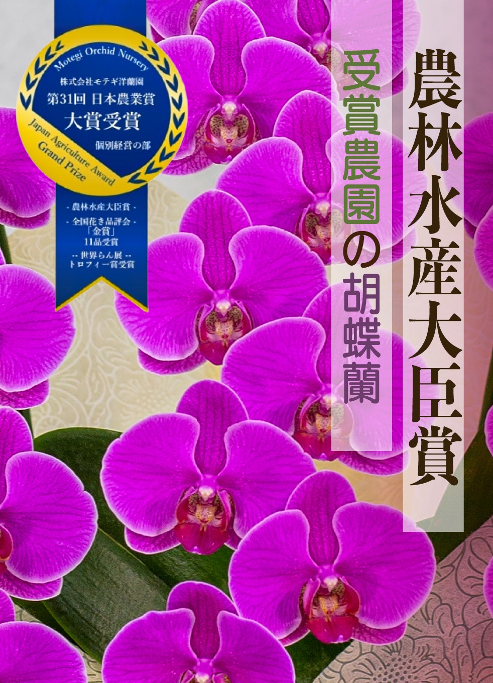各種品評会で受賞歴があり、3年連続で農林水産大臣賞受賞をしている国内最高と評価されるモテギ洋蘭園の胡蝶蘭の品質をEFLAでぜひご体感ください。