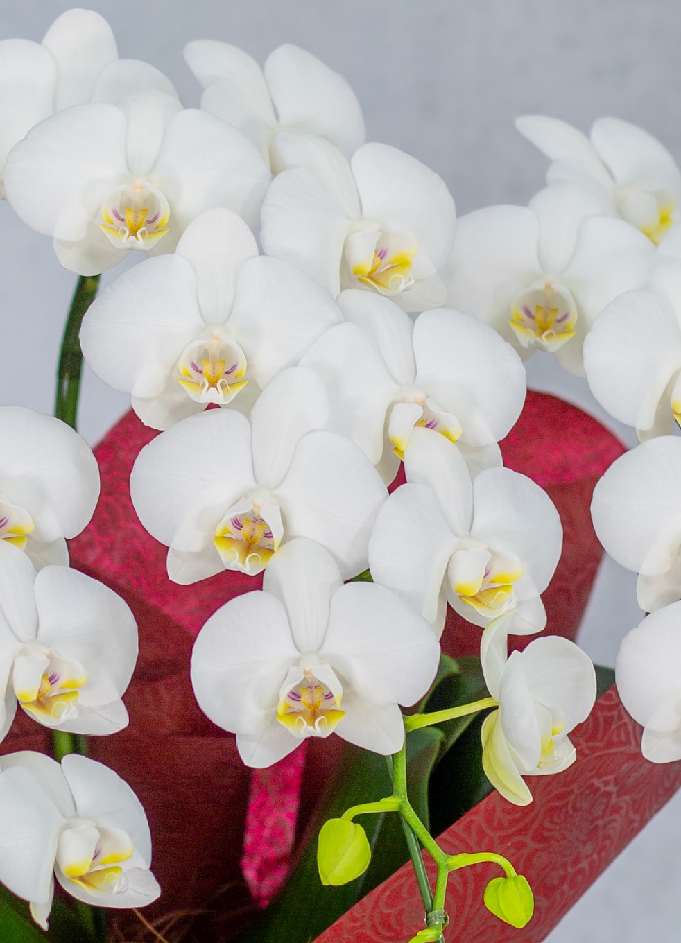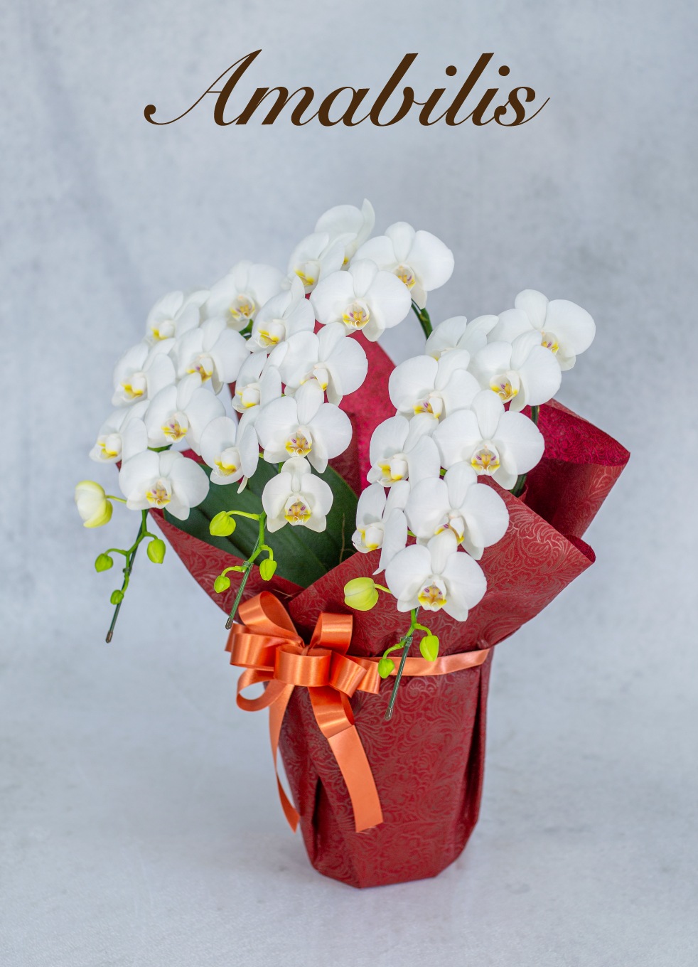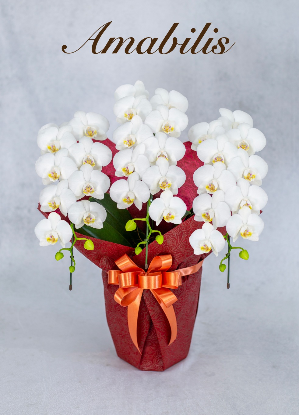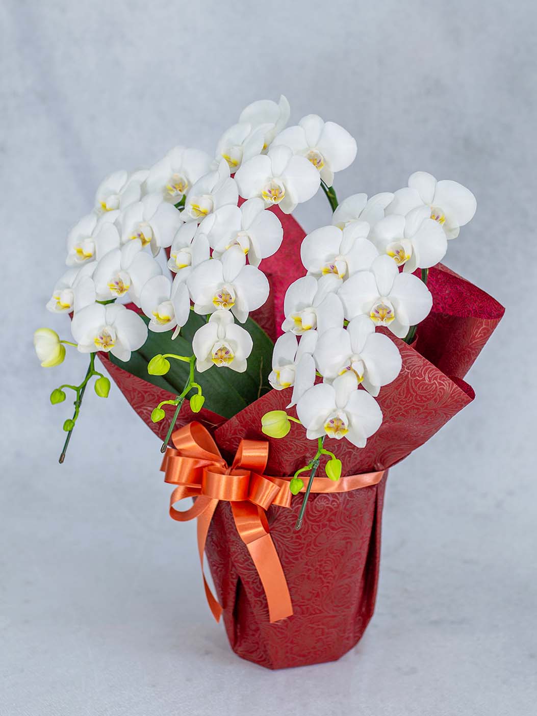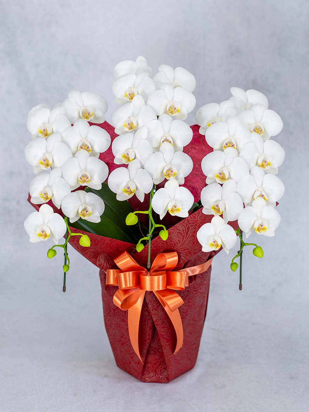 清楚で気品のある白い胡蝶蘭は年齢、シーンを問わず幅広くご利用いただけ、冠婚葬祭どの用途にも使える万能なミディ胡蝶蘭です。