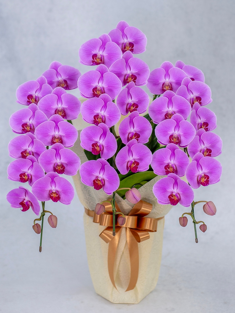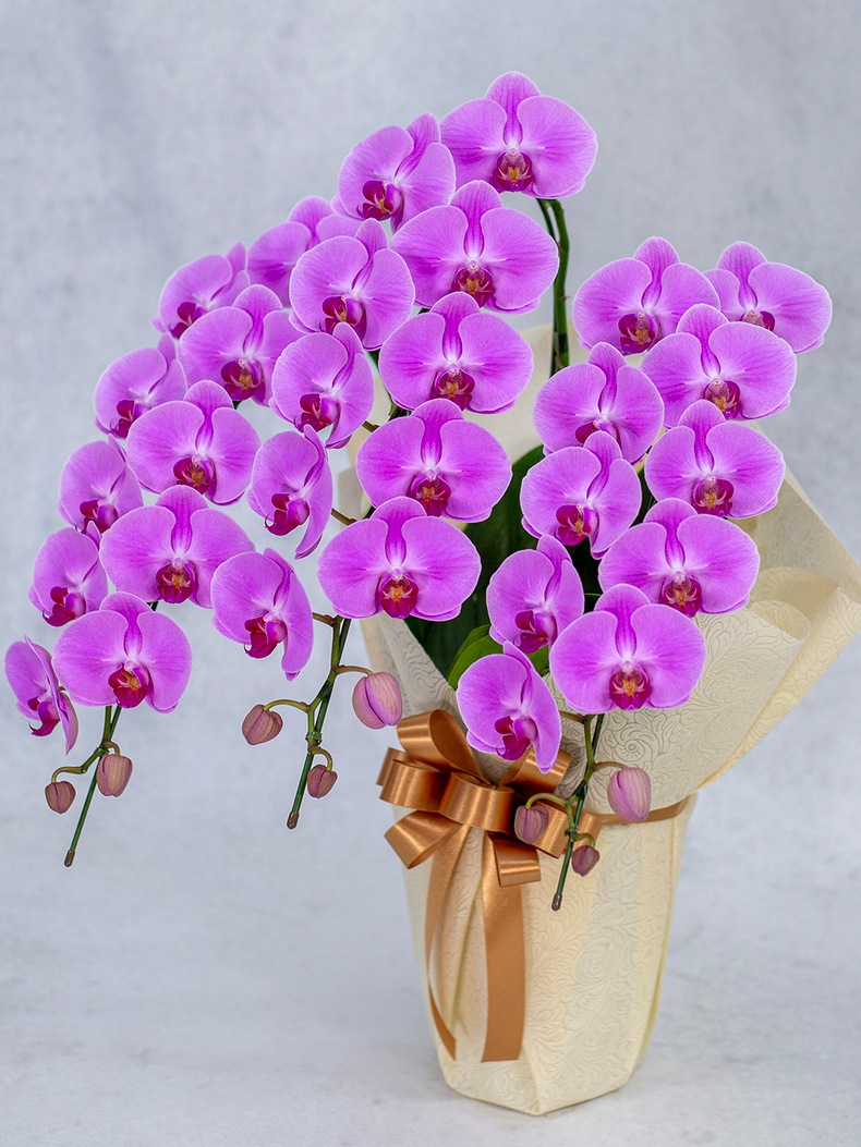一般的な胡蝶蘭より長い育成期間をかけ、花持ち・茎の強さ・花並びが美しい株のみを厳選。